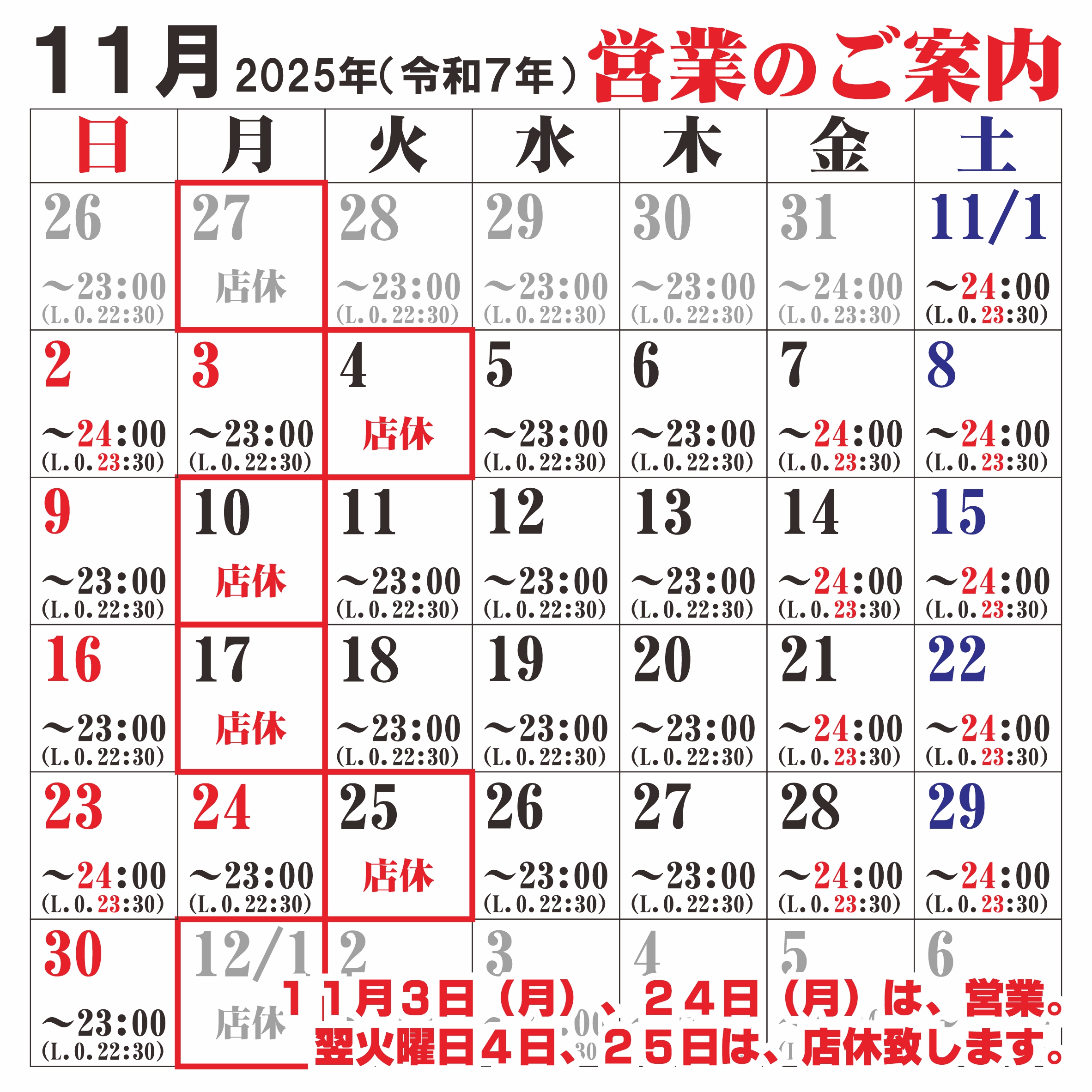 ※11月3日(月)、24日(月)は、祝日のため営業し、翌火曜の4日、25日を店休致します。