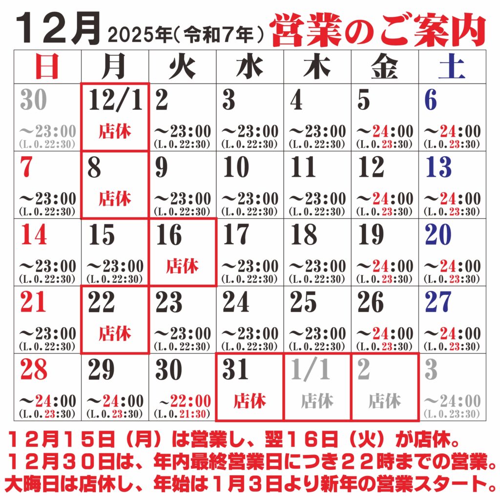 ※12月30日(火)は、年内最終営業日の為、22時までの営業です。